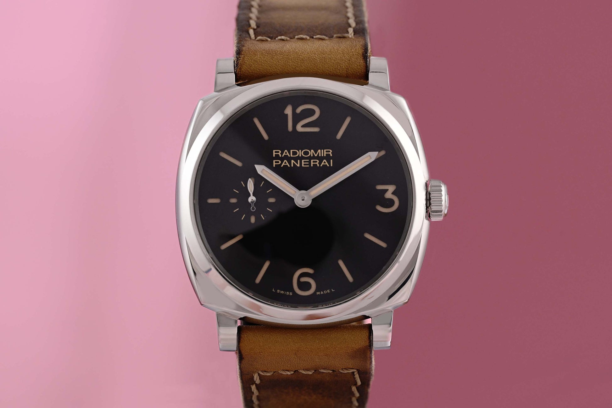 Herrenarmbanduhr PANERAI Radiomir 1940, Ref. PAM00512, Handaufzug, Gehäuse in Edelstahl mit Lederband und Dornschließe, Durchmesser 42 mm, schwarzes Zifferblatt, schöner unpolierter Zustand, Kaufdatum nicht in Papiere eingetragen, ca. 2015, Box & Papiere.