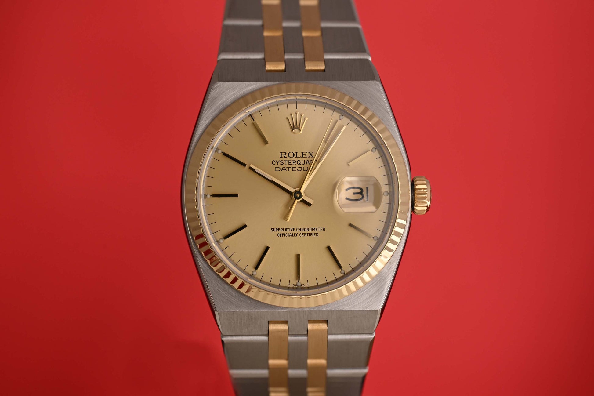 Herrenarmbanduhr ROLEX Datejust Oysterquartz, Ref. 17013, Quarz, Gehäuse und Gliederarmband aus Stahl/Gold, sehr schöner Zustand, goldenes Zifferblatt, Kaufdatum Juli 1980, Box & Papiere.