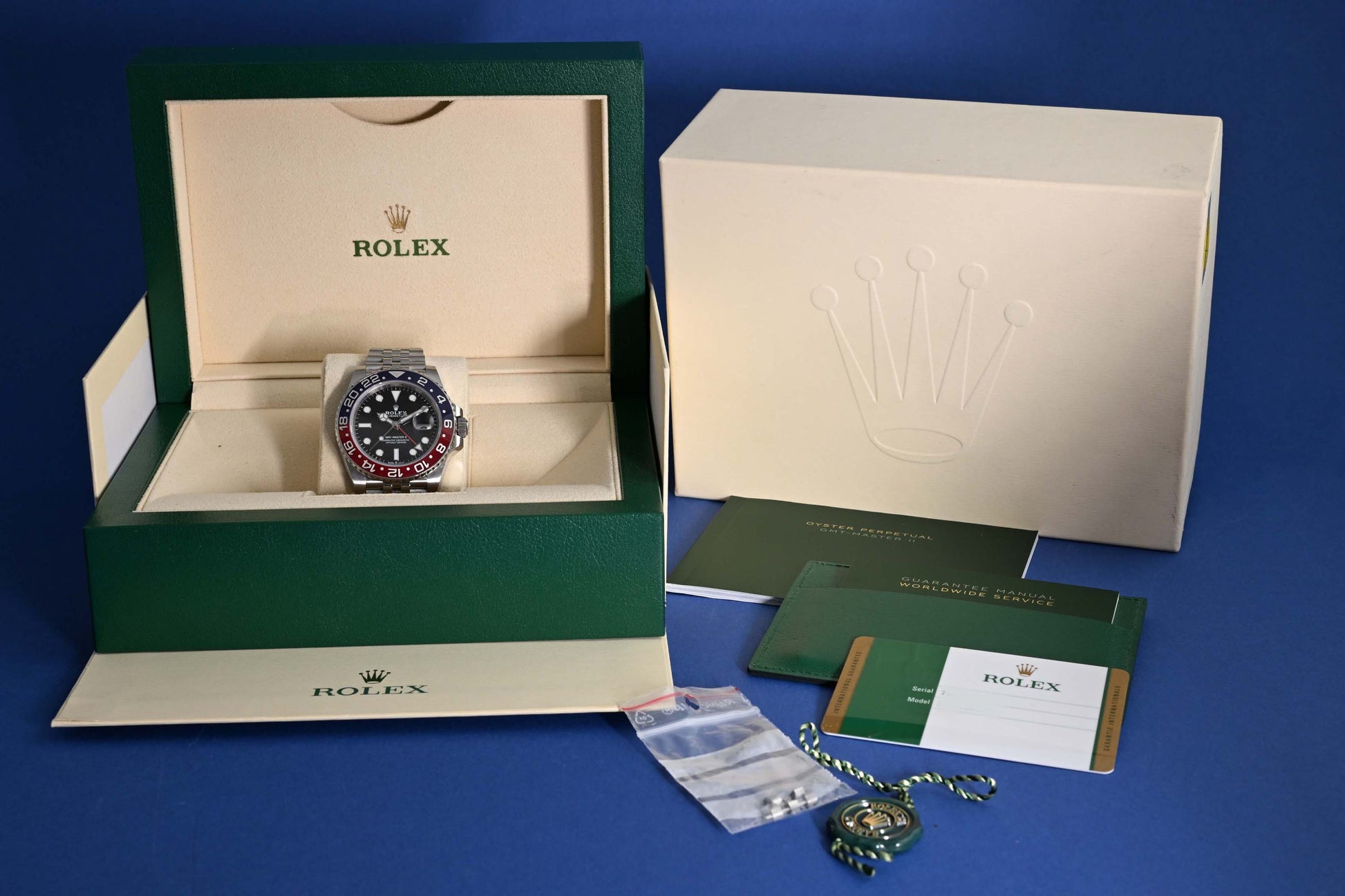 „Full Set“ bedeutet, dass die Uhr mit ihrer originalen Box, den Papieren und Zubehörteilen geliefert wird, die sie ursprünglich vom Hersteller erhalten hat.
