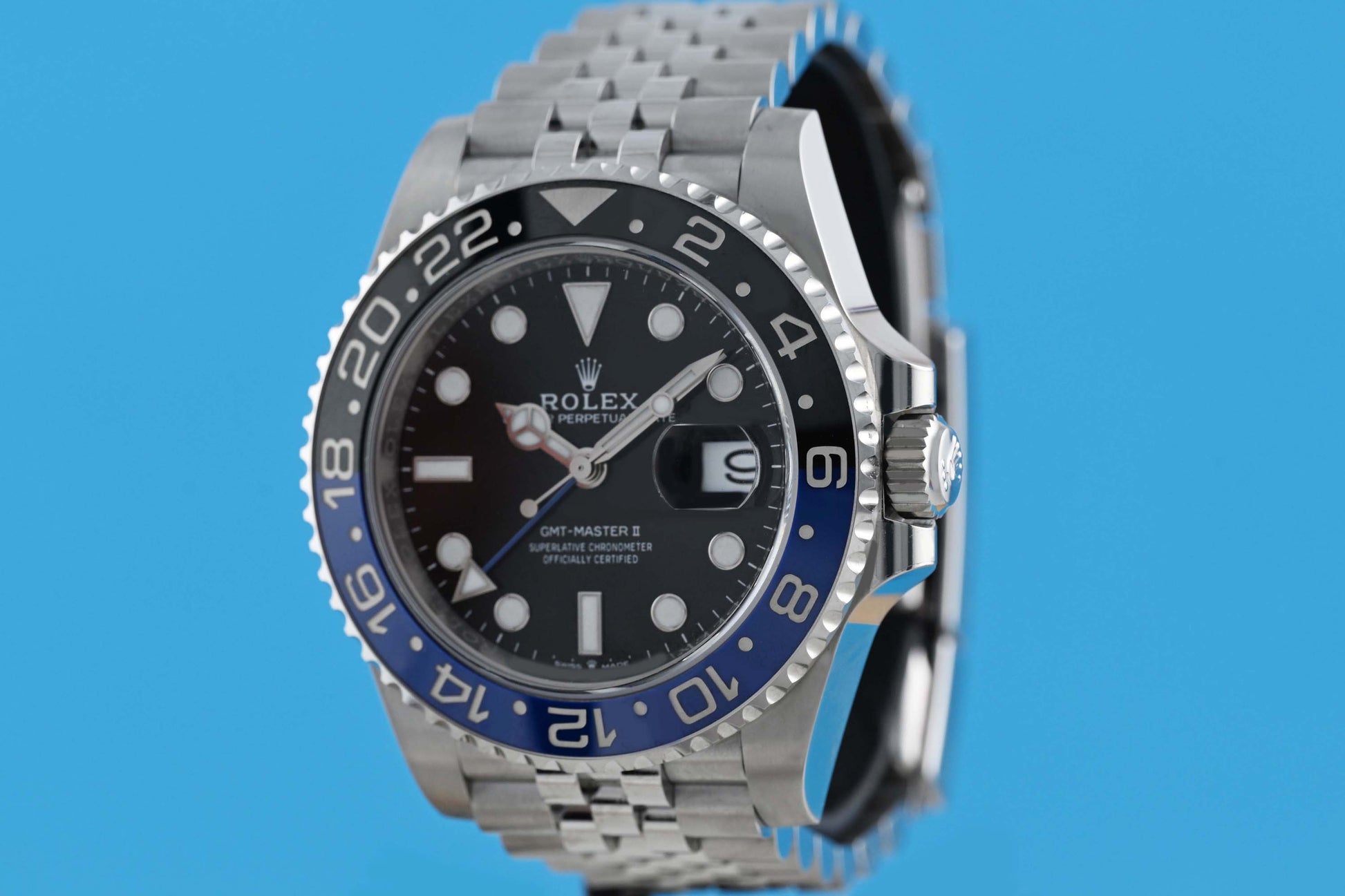 Herrenarmbanduhr ROLEX GMT Master II Batgirl, Ref. 126710BLNR, Automatik, Gehäuse und Jubileeband in Edelstahl mit Faltschließe, Durchmesser 40 mm, sehr schöner Zustand, Kaufdatum 2025, Box & Papiere.